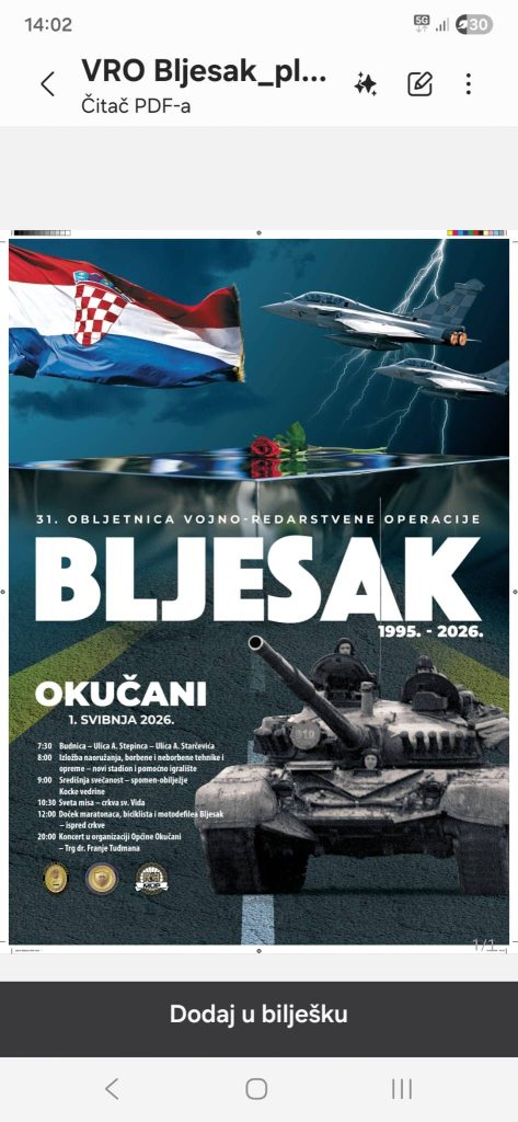 Pozivamo Vas na prisustvovanje 31. obljetnici vojno-redarstvene operacije Bljesak u Okučanima 1. Svibnja 2026. godine.