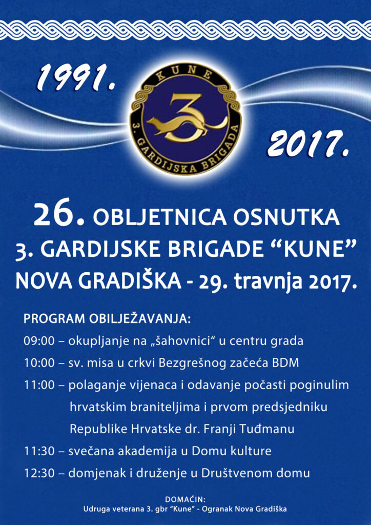 Dana 29. travnja 2017. godine u Novoj Gradiški održat će se centralna proslava obilježavanja 26. obljetnice osnutka 3. GBR – KUNE. Proslavu organiziraju sve udruge…