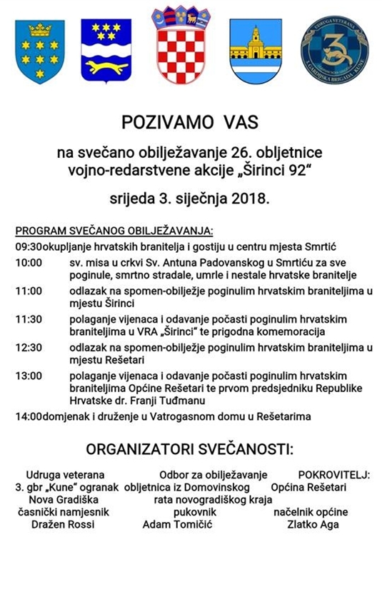 Na poziv ogranka naše udruge Nova gradiška, dana 03. siječnja 2018. godine, naše izaslanstvo je bilo nazočno obilježavanju VRO “Širinci 92”. Obzirom da je navedeni ogranak naše udruge bio ujedno i organizator te smo iz centralnog tijela naše udruge i ostalih podružnica, otišli odati počast svim poginulim braniteljima u ovoj akciji. Svečanosti su nazočili izaslanik Vlade Republike Hrvatske, Ministarstva obrane i oružanih snaga Republike Hrvatske, zapovjednik Hrvatske kopnene vojske brigadni general Siniša Jurković, pomoćnik ministra hrvatskih branitelja Nenad Križić, zapovjednik gardijske oklopno mehanizirane briagde brigadni general Denis Tretinjak, saborski zastupnik Davor Vlaović, zamjenik župana Brodsko posavske županije Stjepan Bošnjaković, pročelnik županijskog Upravnog odjela za poljoprivredu Željko Burazović, zamjenica gradonačelnika Grada Nova Gradiška Ivana Trupina i koordinator za branitelje Vlatko Greiner, načelnici Općina Gornji Bogićevci, Cernik i Rešetari, predstavnici Općine Okučani, ratni zapovjednici, predstavnici Policijske uprave brodsko posavske na čelu s načelnikom Antunom Valićem, načelnici Policijskih uprava Nova Gradiška, Stara Gradiška i Okučani Marin Marjanović, Miroslav Matić i Zrinko Kapetanić, hrvatski branitelji, predstavnici braniteljskih i udruga proisteklih iz Domovinskog rata, političkog života i brojni drugi. Prema protokolu okupljanje sudionika obilježavanje ove obljetnice je bilo u mjestu Smrtiću, a Sveta misa služena je u crkvi Sv. Antuna Padovanskog u Smrtiću za sve poginule, smrtno stradale, umrle i nestale hrvatske branitelje. Potom je izvršeno polaganje vijenaca i paljenje svijeća ispred Spomen obilježja poginulim braniteljima u istom mjestu te održana prigodna komemoracija. Potom se otišlo u mjesto Rešetari, gdje je kod Spomen obilježja poginulim braniteljima Općine Rešetari odana počast poginulim braniteljima i prvom hrvatskom predsjedniku Dr. Franji Tuđmanu. Važno je da su pripadnici 121. brigade , brodske 108. brigade te posebne novogradiške i brodske bojne 3. gardijske brigade i policije su 3. siječnja razbili neprijateljsku obranu i ponovo oslobodili Širince. Tog dana je potpisano i Sarajevsko primirje pa je napredovanje hrvatskih branitelja prema Okučanima i ostalim okupiranim dijelovima županije bilo zaustavljeno. Akcija Širinci je okončana 3. siječnja, ali je zbog neprijateljskog djelovanja unatoč primirju, žrtava bilo i do kraja ožujka 1992. godine. Ukupno je u Akciji Širinci poginulo 18 naših branitelja, 22 su bila ranjena. U ime predsjedništva udruge želimo se zahvaliti organizatorima i našem ogranku Nova Gradiška na pozivnici te dobroj organizaciji, a svim poginulim braniteljima u ovoj akciji, kao i Domovinskom ratu općenito veliko HVALA te neka im pokoj vječni daruje Gospodin, laka im hrvatska gruda i svjetlost vječna svjetlila im. Ostatak fotografija sa ovog obilježavanja možete pogledati na linku ispod objave.
